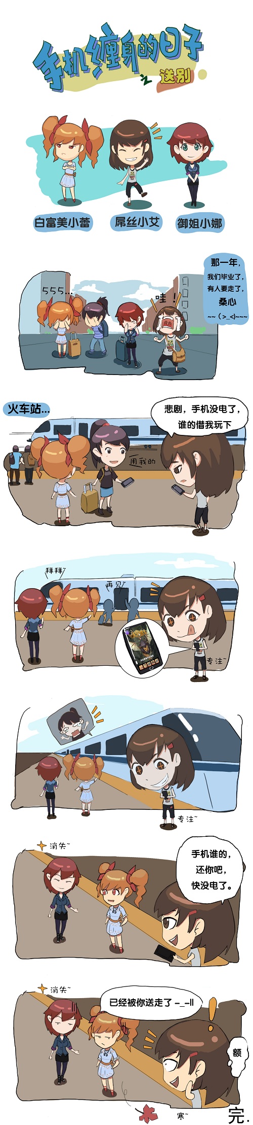 在这一期《手机缠身的日子》中,小蕾、小艾和小娜已经离开校园奔波在求职的路上啦。这三位性格迥异的女孩,在求职的过程会有怎样的奇遇呢?难道屌丝小艾真的是传说中的腹黑女吗?看了下面的漫画想必大家都会有这样的感觉,二货朋友伤不起呀。废话不多说,上图咯~
