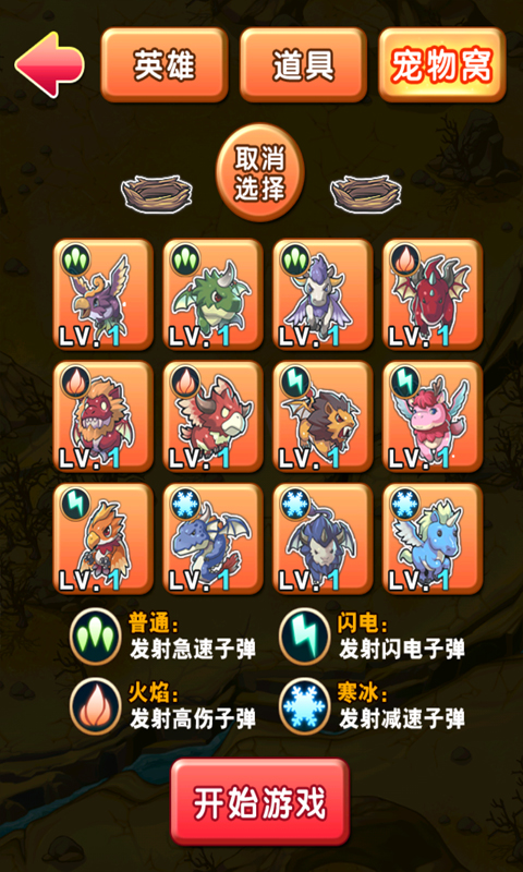 普通型攻速快,伤害低。火焰型伤害高,却攻速低。闪电型虽然攻击力最高,但需要蓄力攻击。而冰霜型干脆没有攻击力,但是通过攻击可以降低敌人的前进速度。因此,不同宠物的选择将使您的战斗方式更加多样、充满个性。